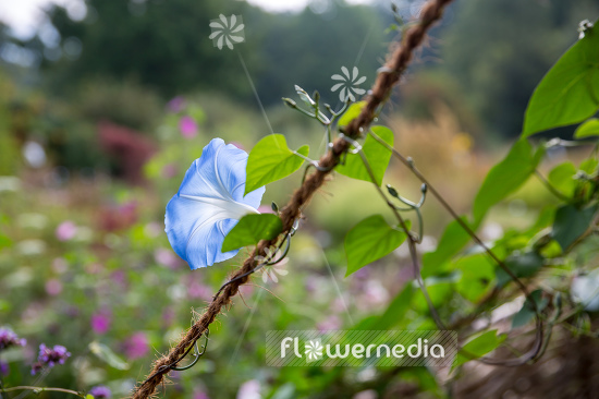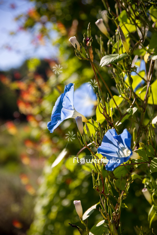 Mexican morning glory with the scientific name: Ipomoea tricolor 'Heavenly Blue', a variety of the genus Ipomoea (Evening glory) in the family Convolvulaceae.