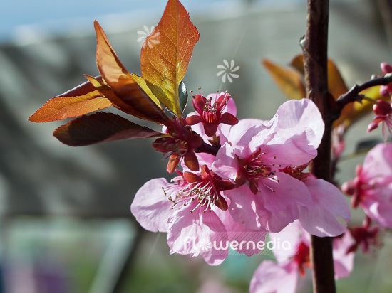 Peach with the scientific name: Prunus persica 'Spring Glory', a variety of the genus Prunus (Stonefruit) in the family Rosaceae.