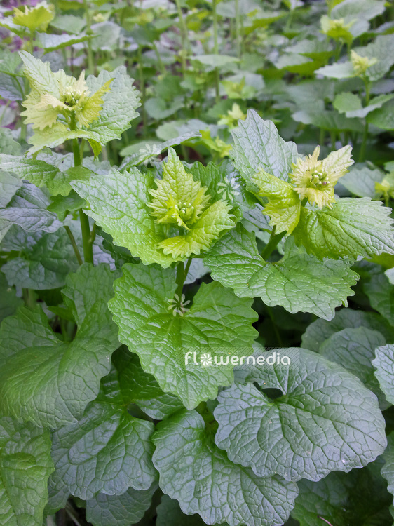 Garlic mustard with the scientific name: Alliaria petiolata, a species of the genus Alliaria (Garlic mustard) in the family Brassicaceae.