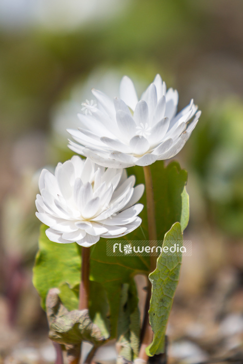 Double red puccoon with the scientific name: Sanguinaria canadensis f. multiplex 'Plena', a variety of the genus Sanguinaria (Bloodroot) in the family Papaveraceae.