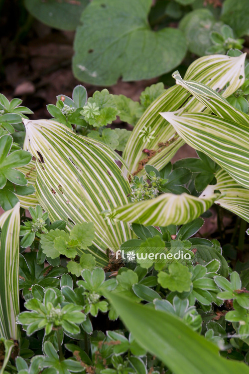 Lily of the valley with the scientific name: Convallaria majalis 'Albostriata', a variety of the genus Convallaria (Lily of the Valley) in the family Asparagaceae.