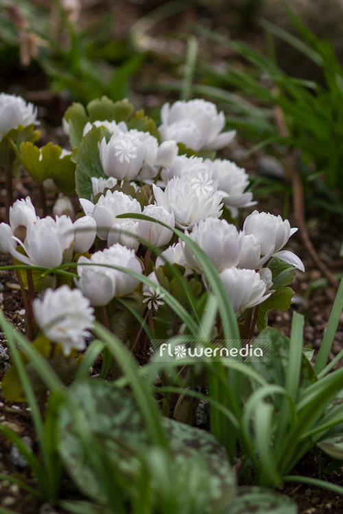 Double red puccoon with the scientific name: Sanguinaria canadensis f. multiplex 'Plena', a variety of the genus Sanguinaria (Bloodroot) in the family Papaveraceae.