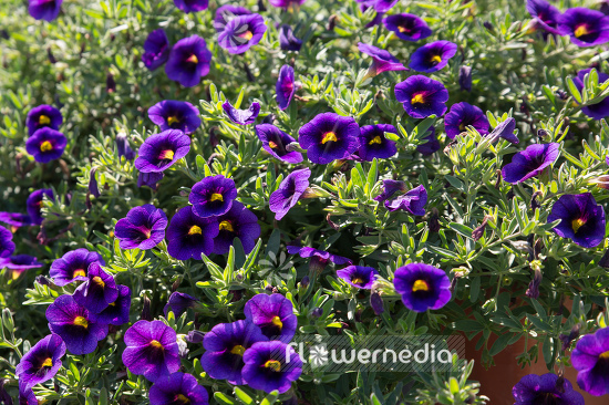 Mini petunia with the scientific name: Calibrachoa 'Calibasket Midnight', a variety of the genus Calibrachoa in the family Solanaceae.