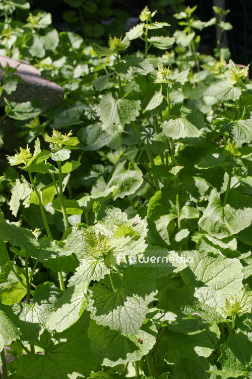 Garlic mustard with the scientific name: Alliaria petiolata, a species of the genus Alliaria (Garlic mustard) in the family Brassicaceae.