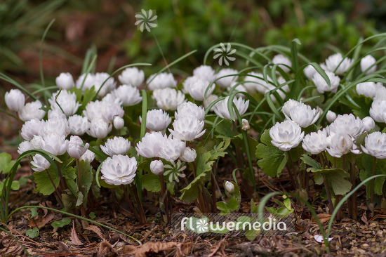 Double red puccoon with the scientific name: Sanguinaria canadensis f. multiplex 'Plena', a variety of the genus Sanguinaria (Bloodroot) in the family Papaveraceae.